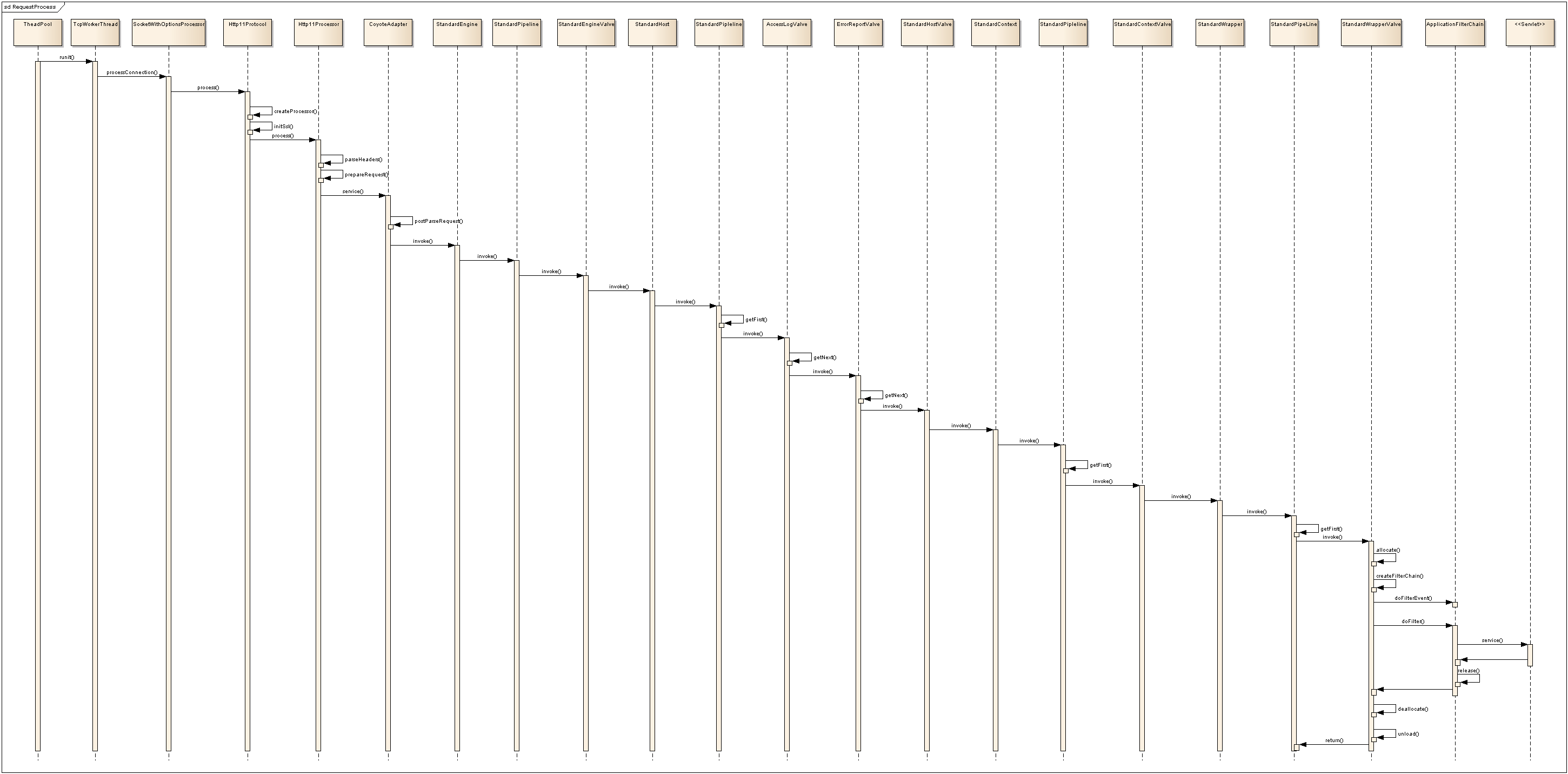 This page describes the process used by Tomcat to handle an incoming request. This process is largely defined by the Servlet Specification, which outlines the order of events that must take place.
